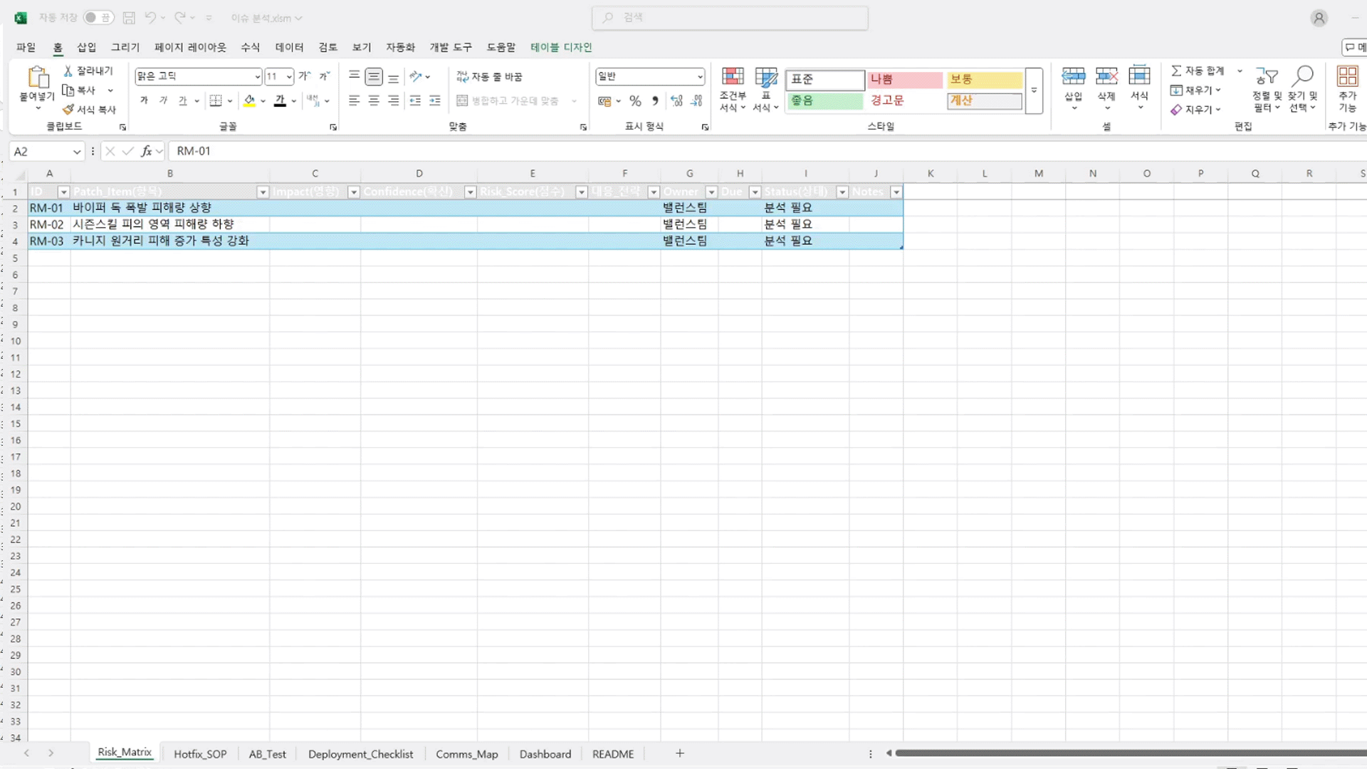 : Patch ID, 전·후 수치, 영향,